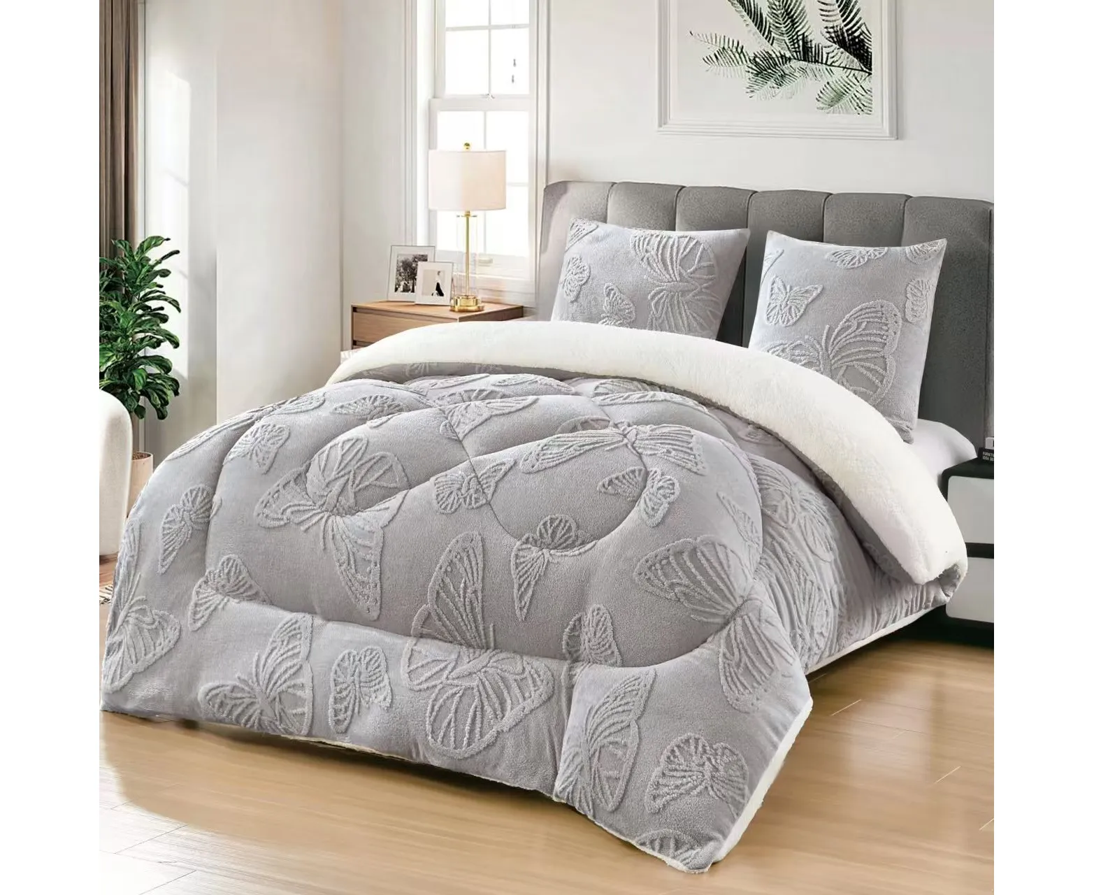 Alege eleganța și confortul absolut cu pilota cu blană 200x230 cm, model fluturi, însoțită de 2 fețe de pernă asortate. Realizată din materiale premium, combina exteriorul catifelat cu interiorul pufos din blăniță, oferind căldură și un somn odihnitor în nopțile reci. Designul cu fluturi adaugă un plus de stil și rafinament dormitorului tău.