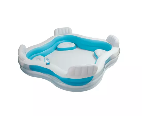 Piscina Intex are in componenta sa doua camere largi de aer, fiecare cu valva dubla de aspirare si valva de evacuare. Conceputa pentru un grad de confort ridicat, piscina are peretii laterali extra-largi, fabricati din vinil testat pentru rezistenta si patru locuri de relaxare in interior cu sezut si spatar gonflabil.