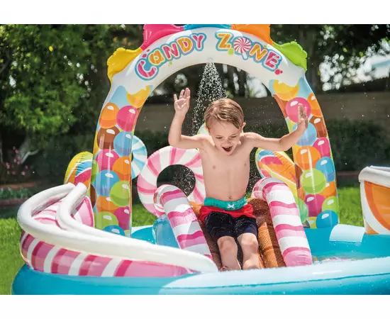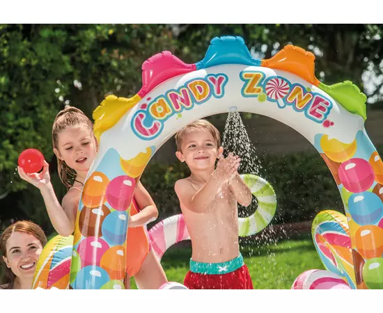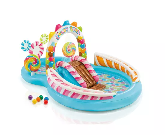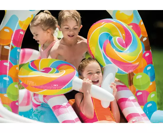 Incluse in pachet sunt mingi colorate, un sistem de pulverizare a apei, o serie de acadele gonflabile detasabile pentru joaca, gonflabile, un tobogan in forma de ciocolata, 3 cercuri gonflabile pentru jocul de aruncat la tinta, respectiv piscina.
