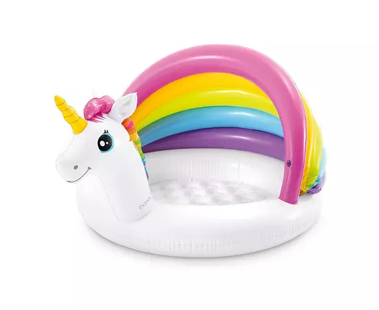 Piscina gonflabila pentru copii Unicorn Intex , este ideala pentru a fi folosita in zilele insorite, deoarece ii protejeaza impotriva radiatiilor solare cu ajutorul acoperisului inclus.
