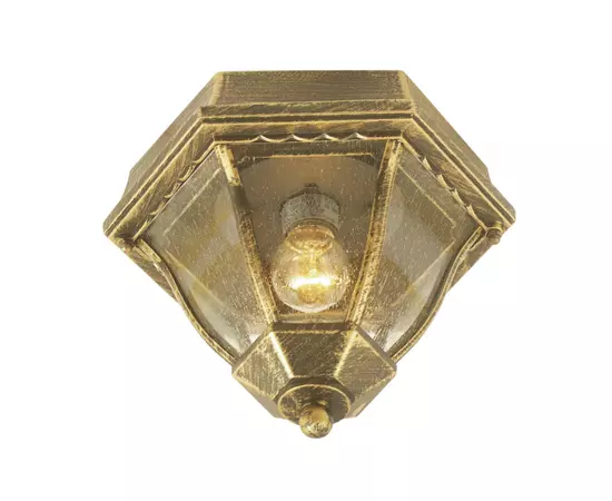 Plafoniera este un corp de iluminat cu structura din aluminiu, finisaj auriu antic si abajur din sticla galbena, orientat in jos.