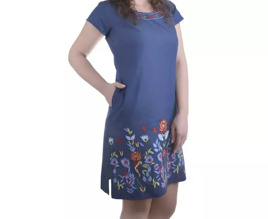 Rochie denim albastra cu motiv floral multicolor - RTM28