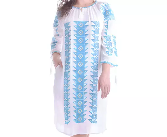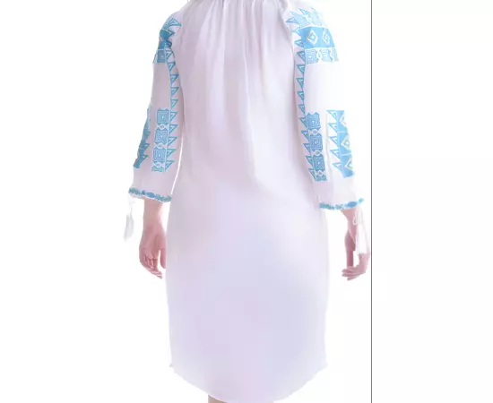 Rochie Traditionala Dreapta Alba cu Motiv Geometric Albastru - RTM17