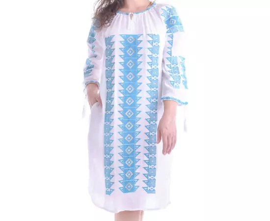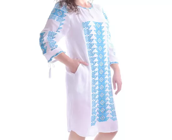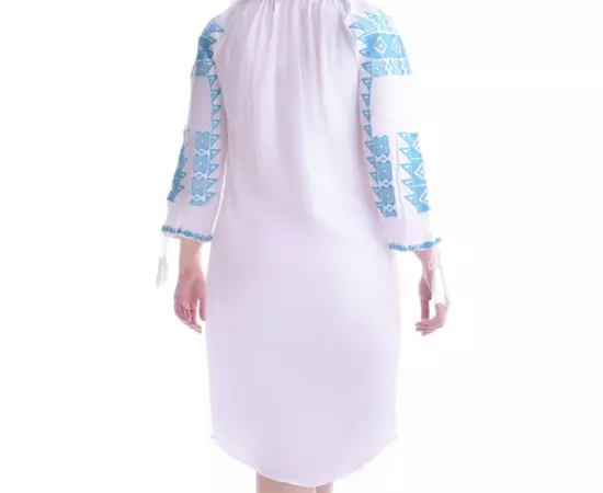 Rochie Traditionala Dreapta Alba cu Motiv Geometric Albastru - RTM17