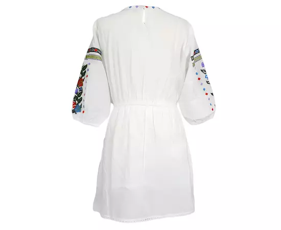 Compleu traditional alb cu motiv traditional multicolor. Compleu compus din ie si fusta. Ia are maneca 3/4 clopot, iar fusta are elastic in talie si dublura la interior.