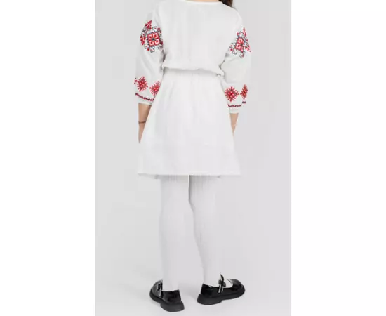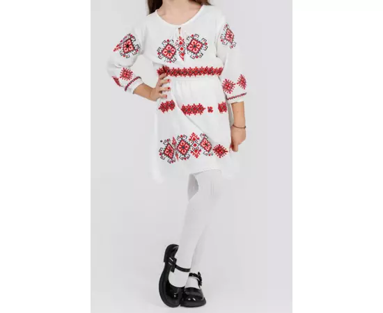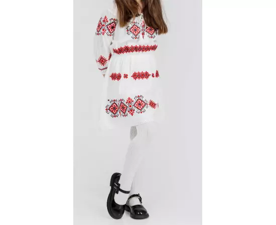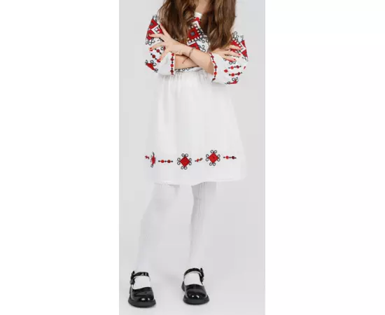 Rochie traditionala alba din bumbac cu maneca 3/4 si motiv traditional rosu