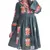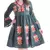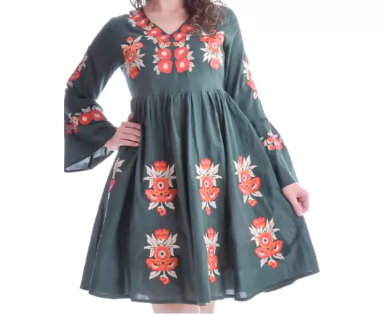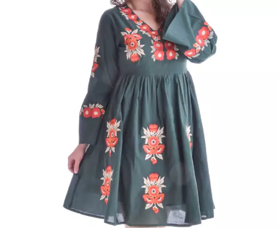 Rochie Traditionala Evazata Verde cu Motiv Floral Rosu - RTM20