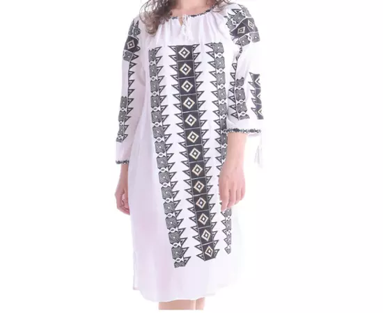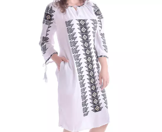 Rochie Traditionala Dreapta Alba cu Motiv Geometric Negru - RTM23