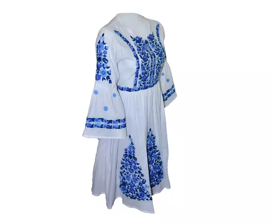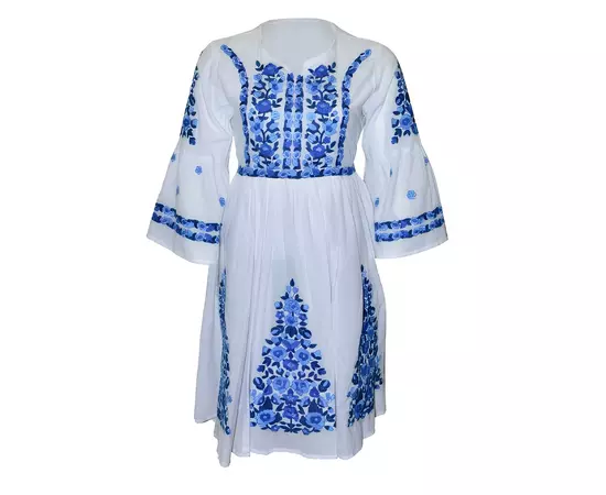 Rochie traditionala evazata alba cu motiv floral albastru - RTM38
