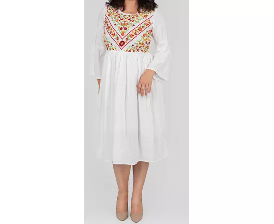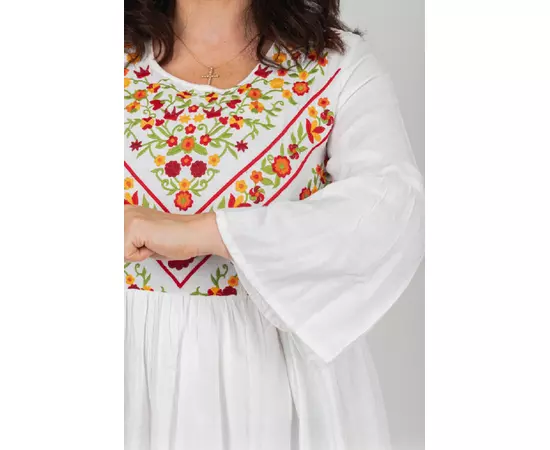 Rochie traditionala midi alba din bumbac cu maneca 3/4 si motiv traditional multicolor