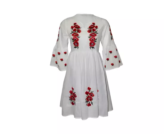 Rochie traditionala midi alba din bumbac cu maneca 3/4 si motiv traditional rosu