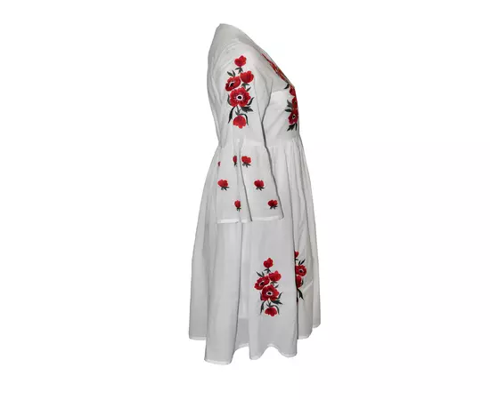 Rochie Traditionala Evazata Alba cu Motiv Floral Rosu- RTM09