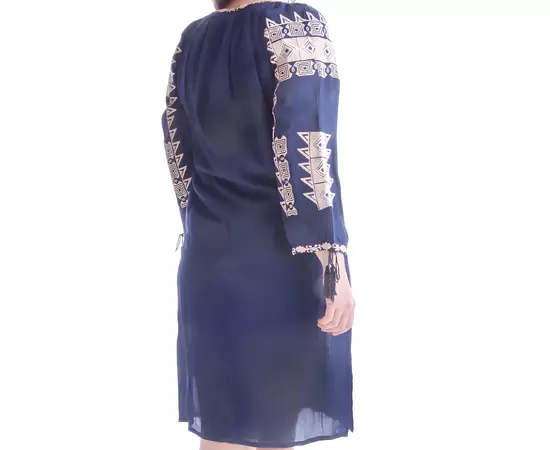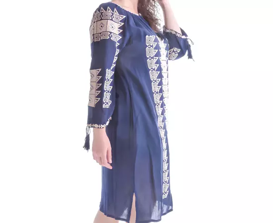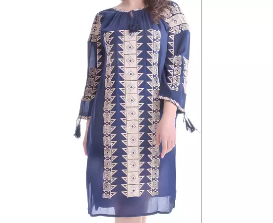Rochie Traditionala Dreapta Albastra cu Motiv Geometric Crem - RTM22