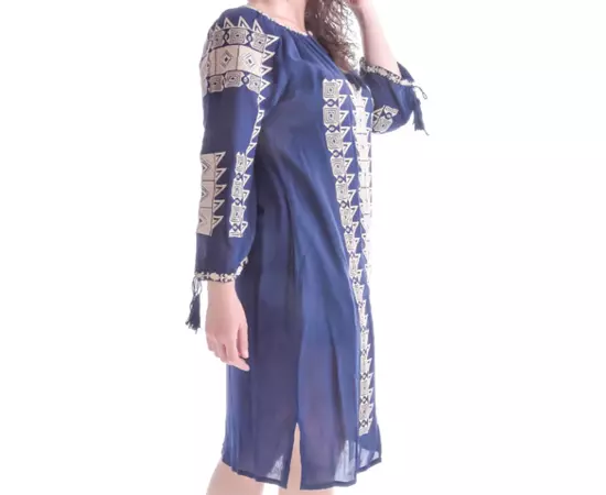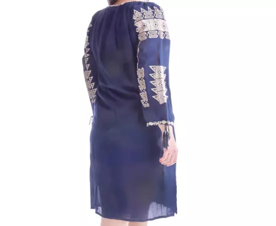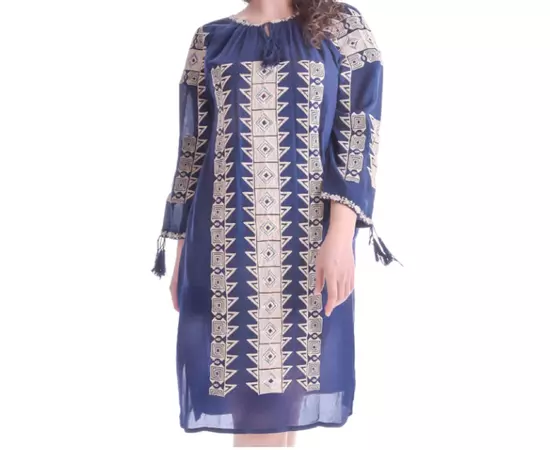 Rochie Traditionala Dreapta Albastra cu Motiv Geometric Crem - RTM22