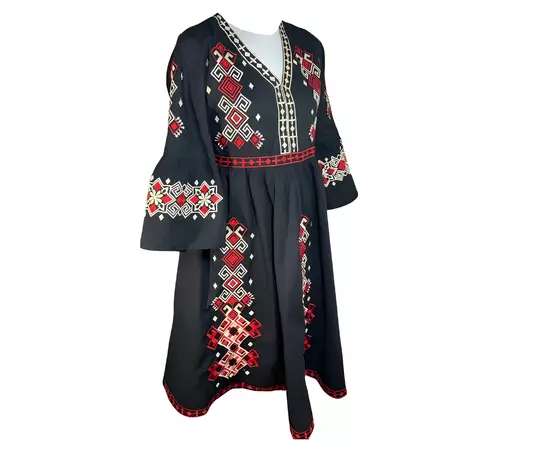 Rochie traditionala evazata neagra cu motiv geometric multicolor - RTM34