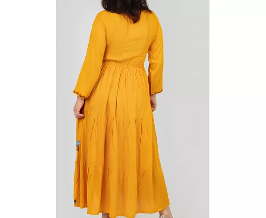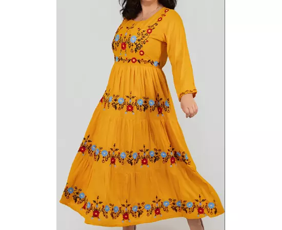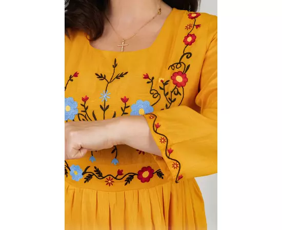 Rochie traditionala galbena cu motiv floral multicolor - RTM57