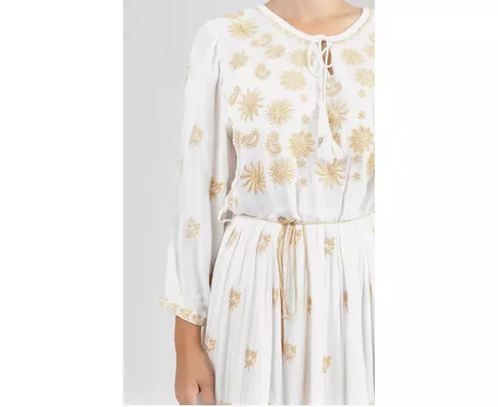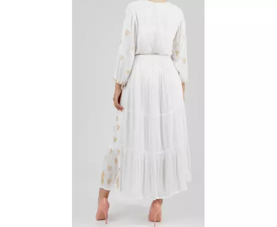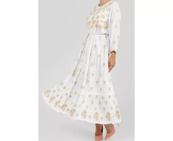 Rochie Traditionala Maxi Alba cu Motiv Floral Auriu - RTM02