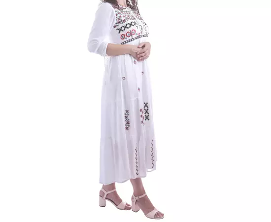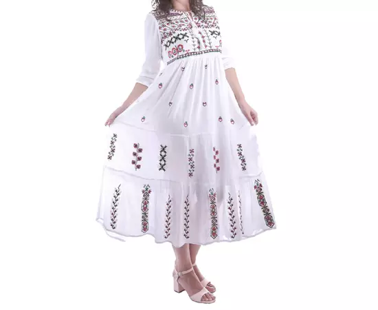 Rochie traditionala maxi alba cu motiv floral multicolor - RTM46