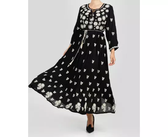 Rochie Traditionala Maxi Neagra cu Motiv Floral Alb - RTM01