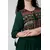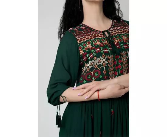 Rochie traditionala verde din celofibra cu maneca 3/4 si motiv traditional multicolor