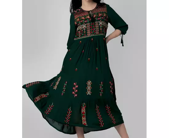 Rochie traditionala maxi verde cu motiv floral multicolor - RTM32