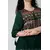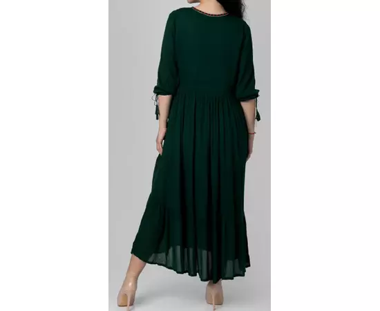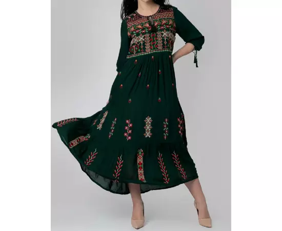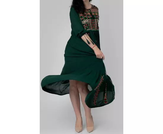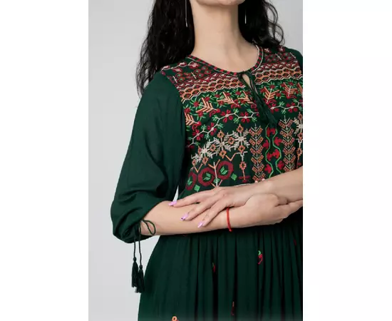 Rochie traditionala verde din celofibra cu maneca 3/4 si motiv traditional multicolor