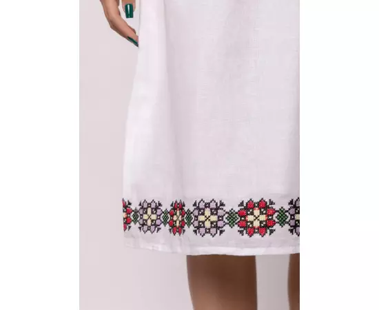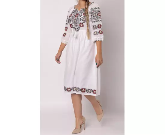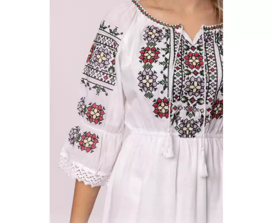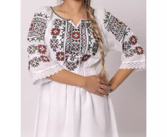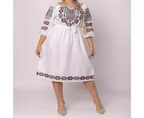 Rochie Traditionala Midi Alba cu Motiv Floral Multicolor - RTM03