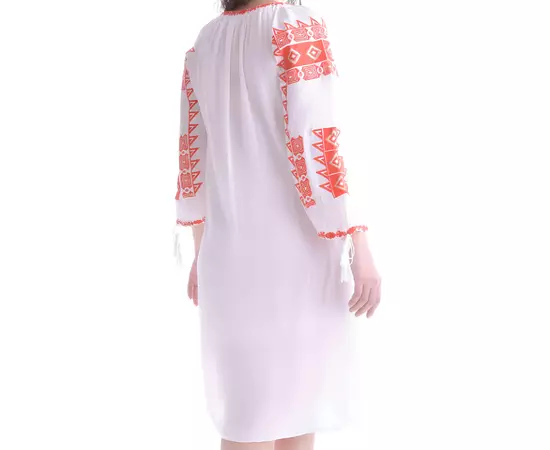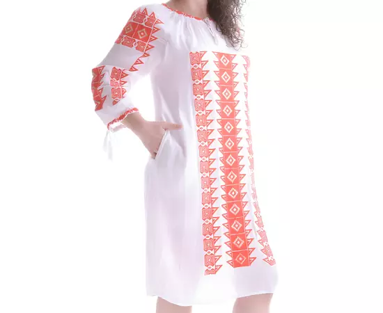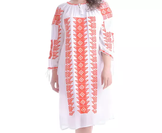 Rochie Traditionala Dreapta Alba cu Motiv Geometric Rosu - RTM19