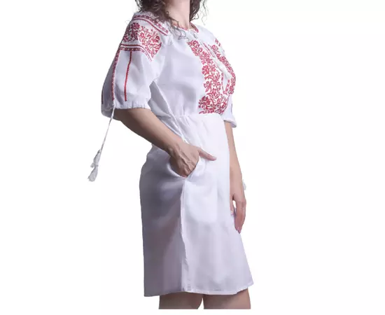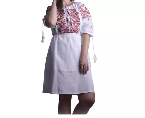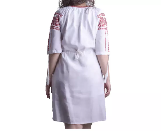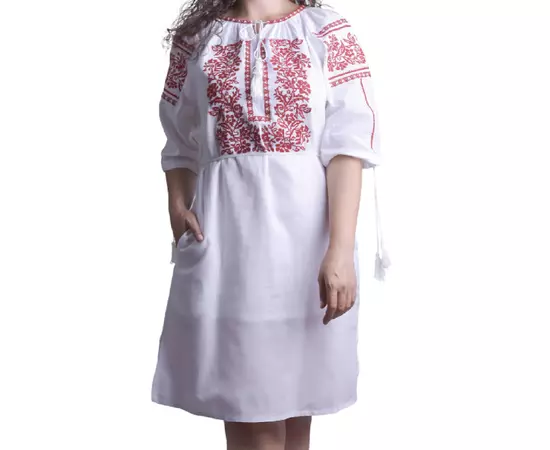 Rochie traditionala midi alba cu motiv floral rosu - RTM36