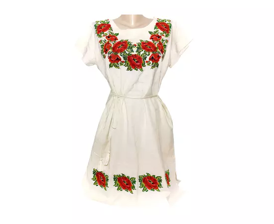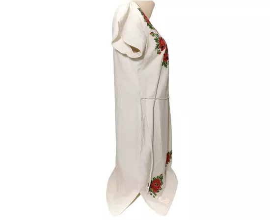 Rochie traditionala crem din viscoza cu maneca scurta si motiv traditional rosu.