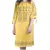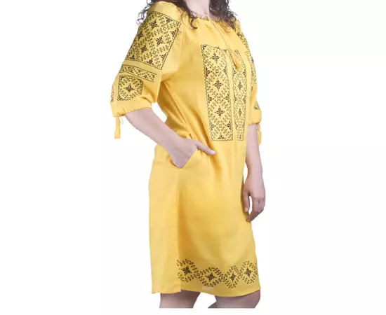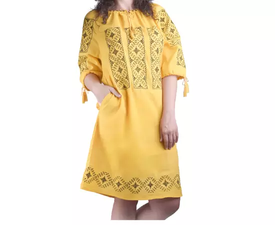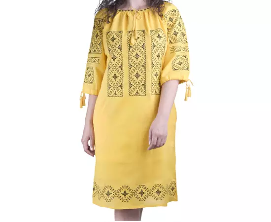Rochie traditionala midi galbena cu motiv geometric negru - RTM47