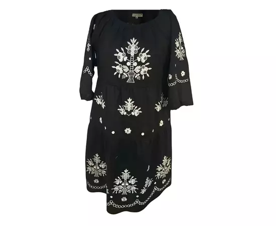 Rochie traditionala neagra din bumbac cu maneca 3/4 si motiv traditional alb
