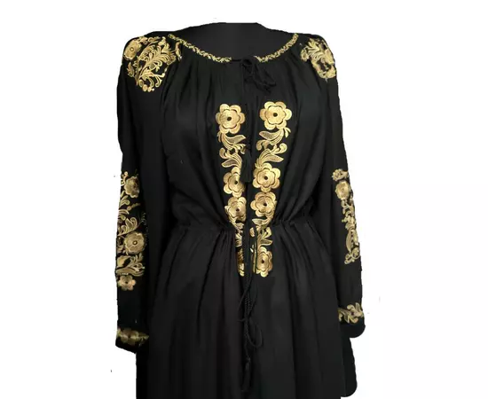 Rochie traditionala midi neagra cu motiv floral auriu - RTM37