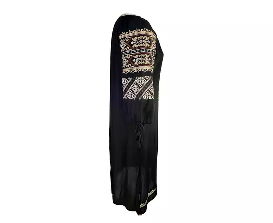 Rochie traditionala neagra din celofibra cu maneca 3/4 si motiv traditional crem