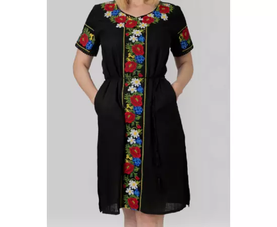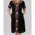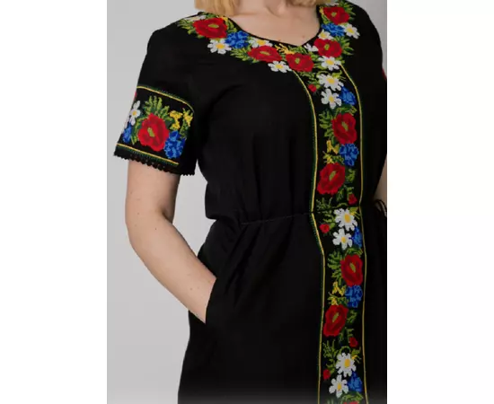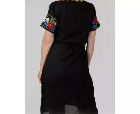 Rochie traditionala neagra din bumbac cu maneca scurta si motiv traditional multicolor