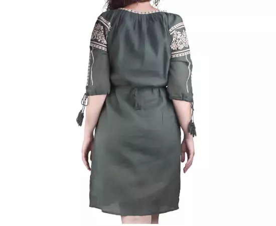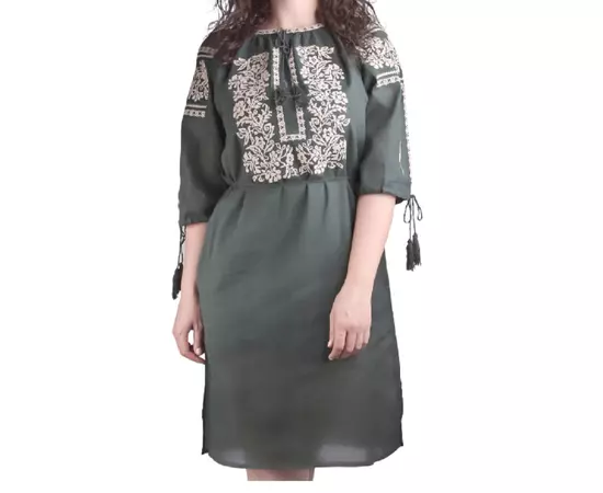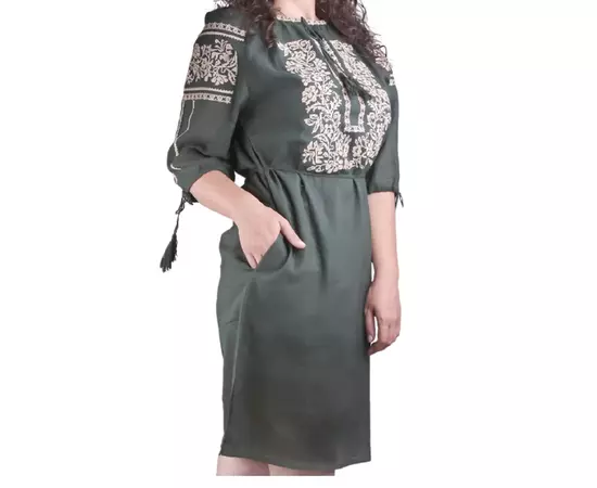 Rochie traditionala midi verde cu motiv floral crem - RTM48