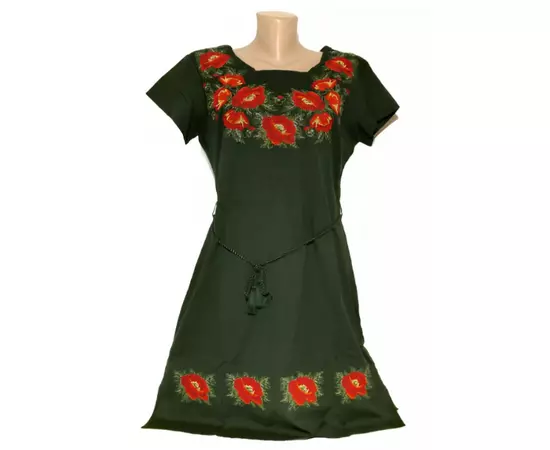 Rochie traditionala verde din viscoza cu maneca scurta si motiv traditional rosu