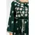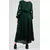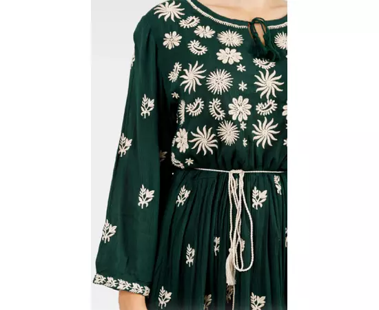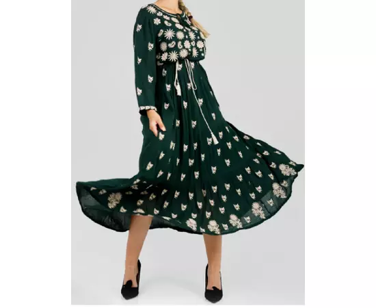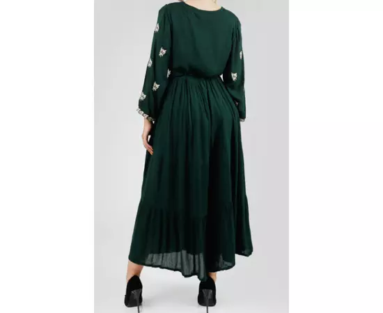 Rochie traditionala verde din bumbac cu maneca lunga si motiv traditional auriu.