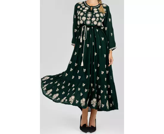 Rochie Traditionala Maxi Verde cu Motiv Floral Auriu - RTM14