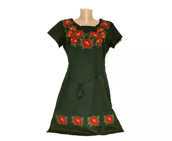 Rochie traditionala verde din viscoza cu maneca scurta si motiv traditional rosu