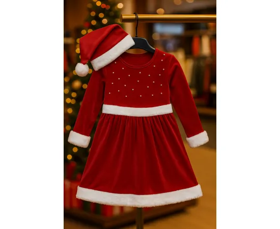 Rochita Rosie de Craciun cu perle si Caciulita - NNK113