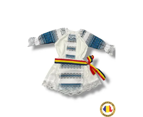 Brâul tricolor adaugă o notă veselă și patriotică, evidențiind mândria față de rădăcinile noastre și frumusețea tradițiilor românești. Materialele folosite sunt delicate și prietenoase cu pielea sensibilă a bebelușilor, asigurând confort maxim și libertate de mișcare. Croiala atentă și proporțiile gândite pentru vârstele de 3, 6 și 12 luni fac ca rochița să fie perfectă pentru micuțele tale prințese.