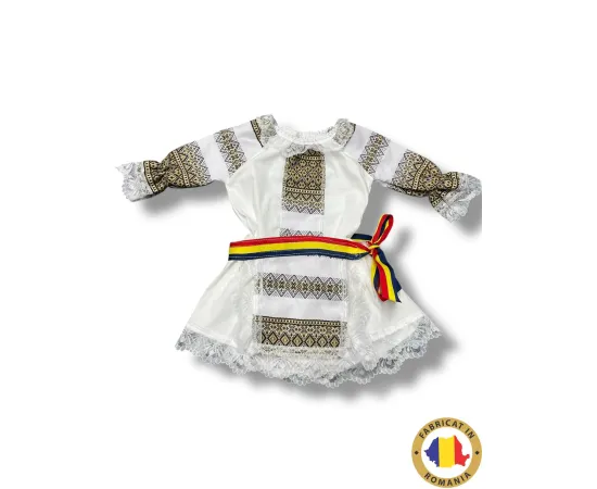 Brâul tricolor adaugă o notă veselă și patriotică, evidențiind mândria față de rădăcinile noastre și frumusețea tradițiilor românești. Materialele folosite sunt delicate și prietenoase cu pielea sensibilă a bebelușilor, asigurând confort maxim și libertate de mișcare. Croiala atentă și proporțiile gândite pentru vârstele de 3, 6 și 12 luni fac ca rochița să fie perfectă pentru micuțele tale prințese.