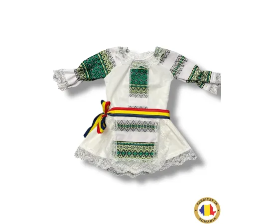 Brâul tricolor adaugă o notă veselă și patriotică, evidențiind mândria față de rădăcinile noastre și frumusețea tradițiilor românești. Materialele folosite sunt delicate și prietenoase cu pielea sensibilă a bebelușilor, asigurând confort maxim și libertate de mișcare. Croiala atentă și proporțiile gândite pentru vârstele de 3, 6 și 12 luni fac ca rochița să fie perfectă pentru micuțele tale prințese.