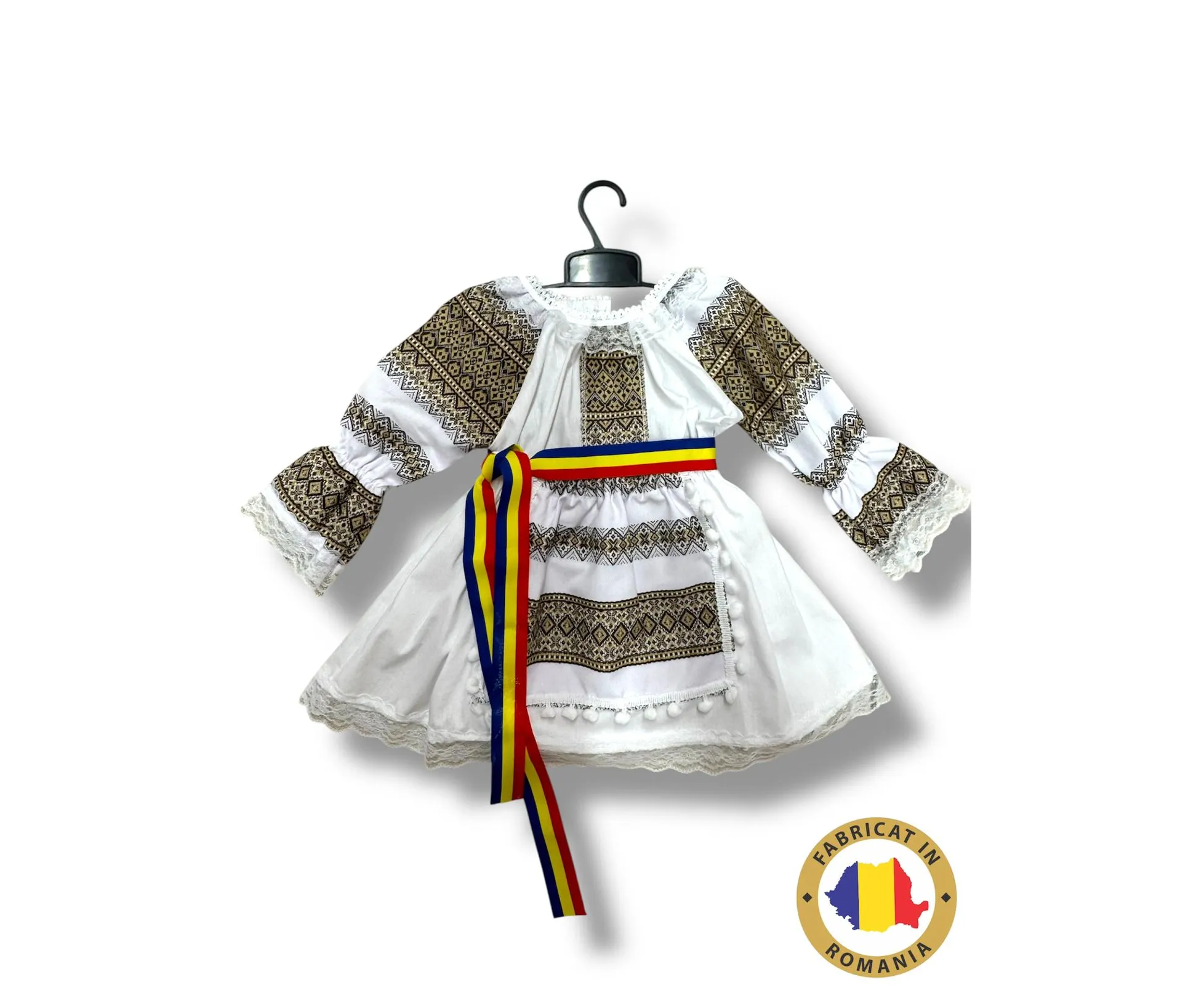 Această rochiță nu este doar un articol vestimentar, ci o expresie a identității și a valorilor românești, perfectă pentru cei care doresc să poarte cu mândrie un simbol al tradiției noastre.