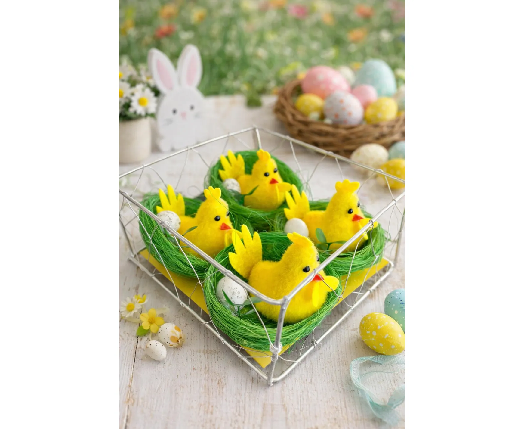 Set 4 pui decorativi in cuib, aranjamente de Paste, galbeni