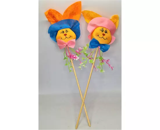 Setul de 2 iepurași de Paște decorativi este format din două figurine pe bat, care sunt concepute special pentru a fi folosite ca elemente decorative în timpul sărbătorii de Paște. Aceștia sunt in doua modele pictati diferit vii și vesel ce pot fi utilizați pentru a decora mese, rafturi, gradini sau ferestre în timpul sărbătorii.
