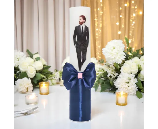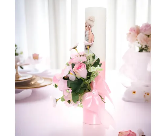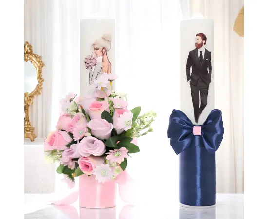 Fiecare lumânare din set este meticulos decorată cu flori delicate și o fundiță subtilă, aducând o notă de frumusețe și rafinament. Florile pot fi realizate din diverse materiale, cum ar fi țesături, mătase artificială sau alte materiale textile, iar fundița adaugă o atingere de eleganță și feminitate.