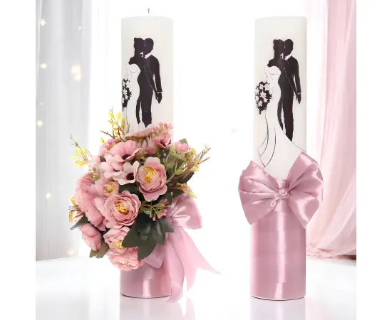 Set 2 Lumanari pentru Nunta cu flori artificiale ROZ - PUDRAT - LN02