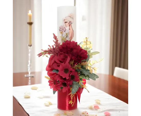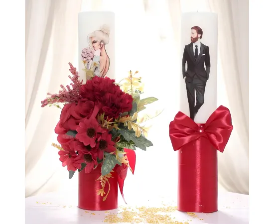 Fiecare lumânare din set este meticulos decorată cu flori delicate și o fundiță subtilă, aducând o notă de frumusețe și rafinament. Florile pot fi realizate din diverse materiale, cum ar fi țesături, mătase artificială sau alte materiale textile, iar fundița adaugă o atingere de eleganță și feminitate.